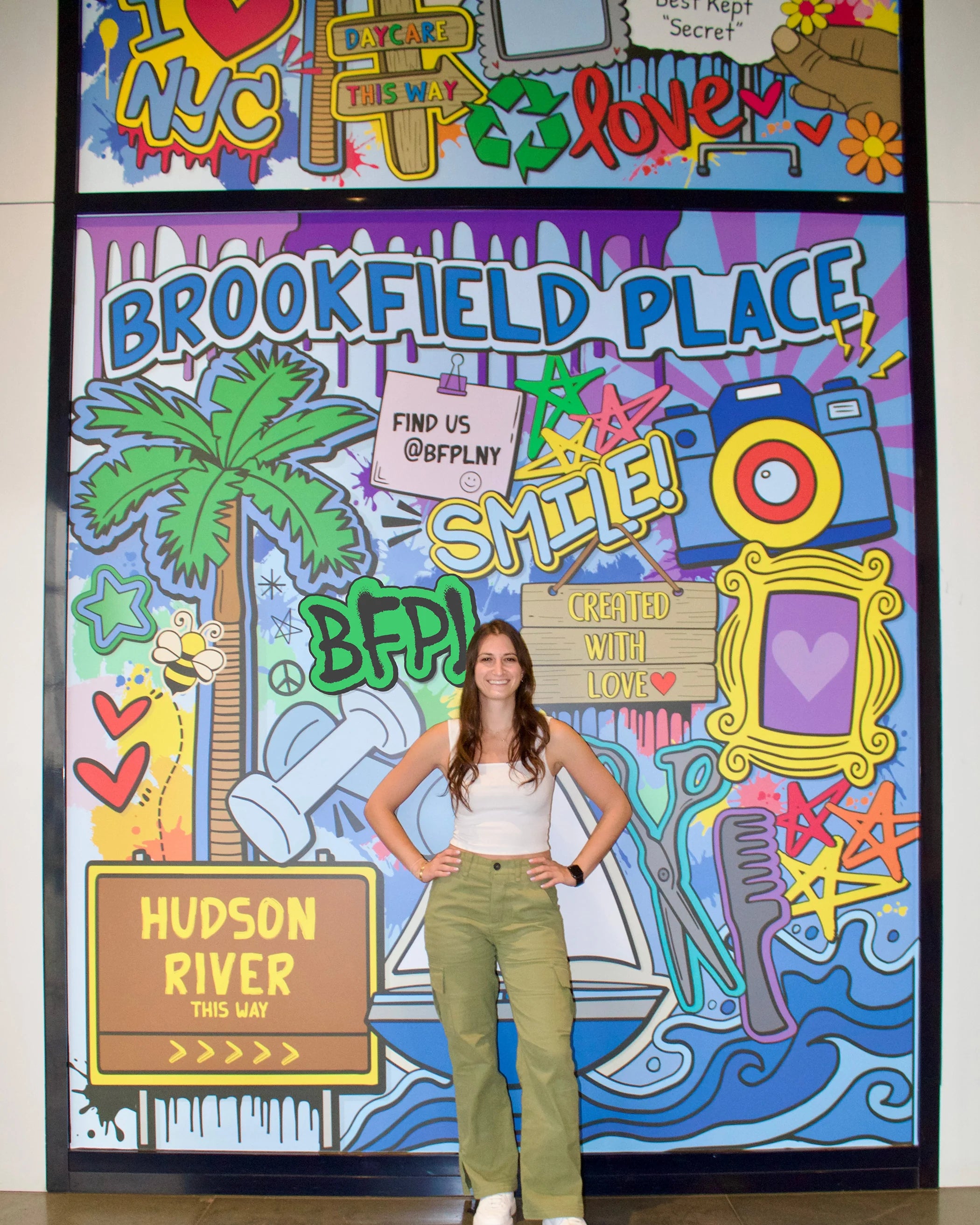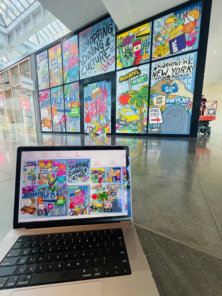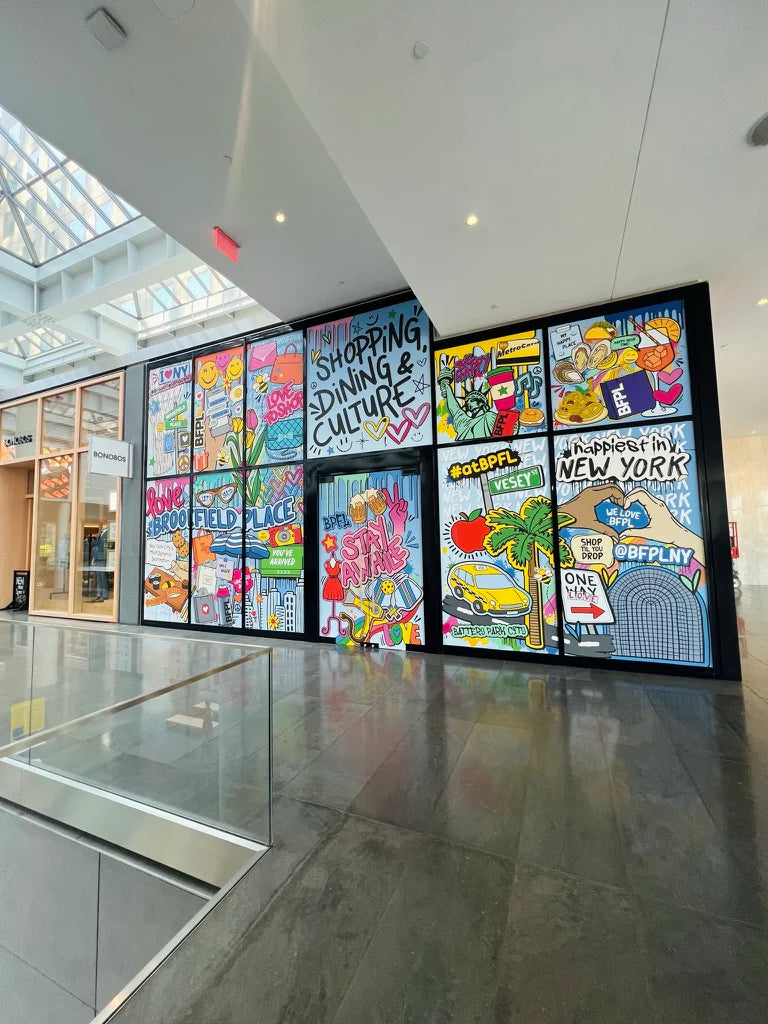 Corey had the opportunity to collaborate with Brookfield Place in New York to create a large wall mural that wrapped the windows of a storefront. This special project was truly so much fun to create! BFPL is New York’s most dynamic destination for shopping, dining, and culture and this design represents all the exciting things that BFPL has to offer! . This was located at 230 Vesey Street in Battery Park City, New York.