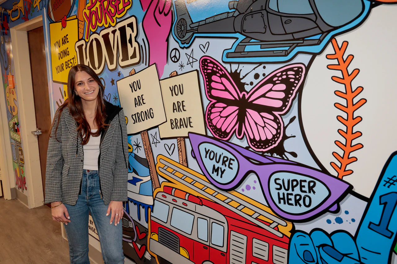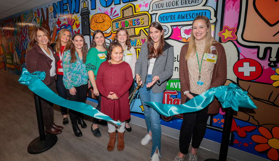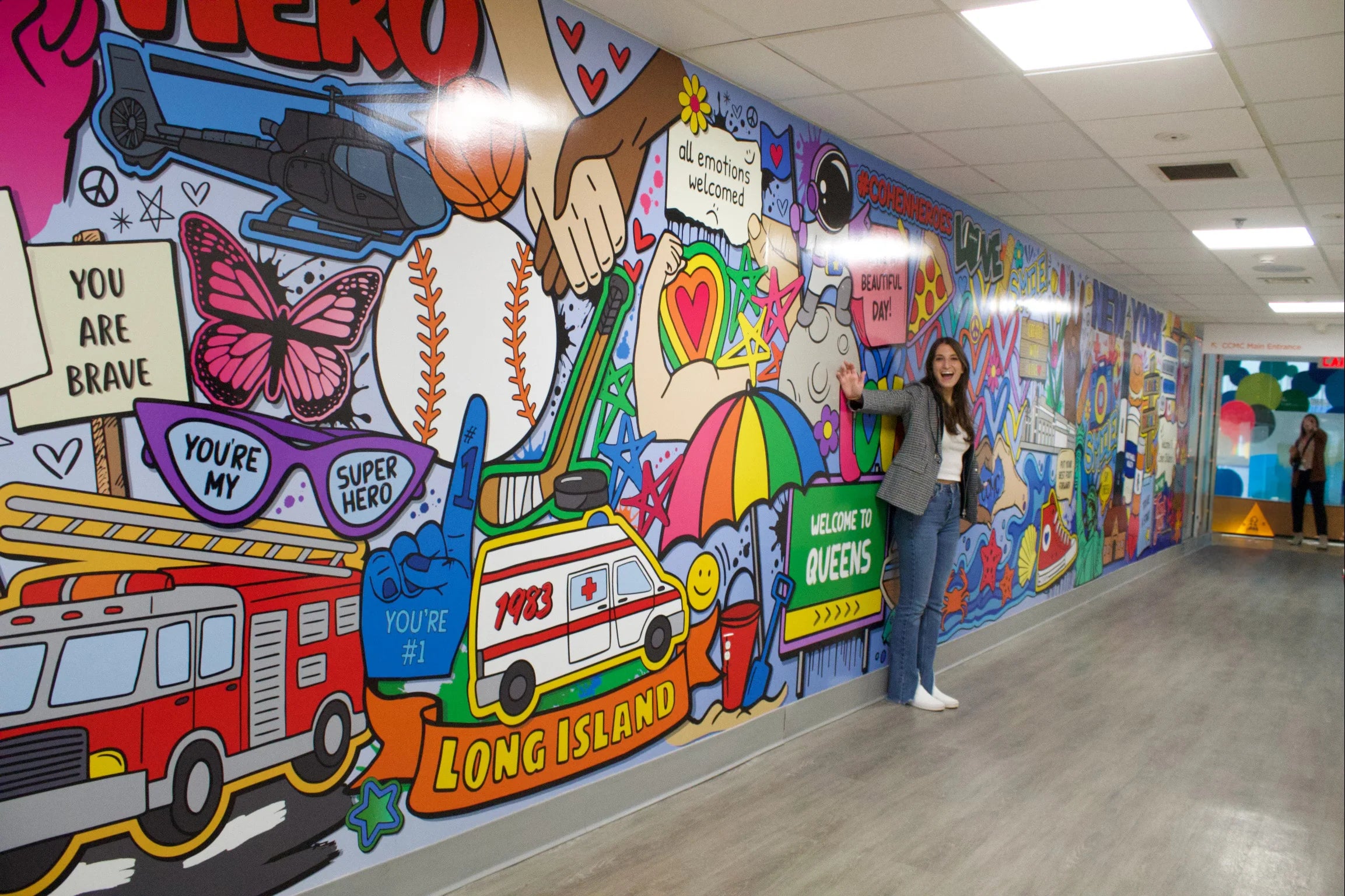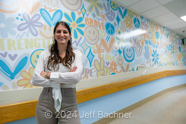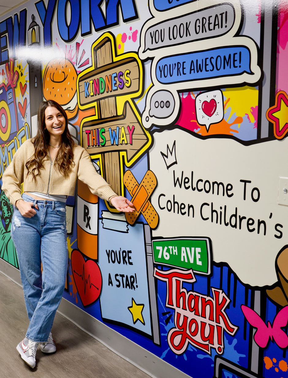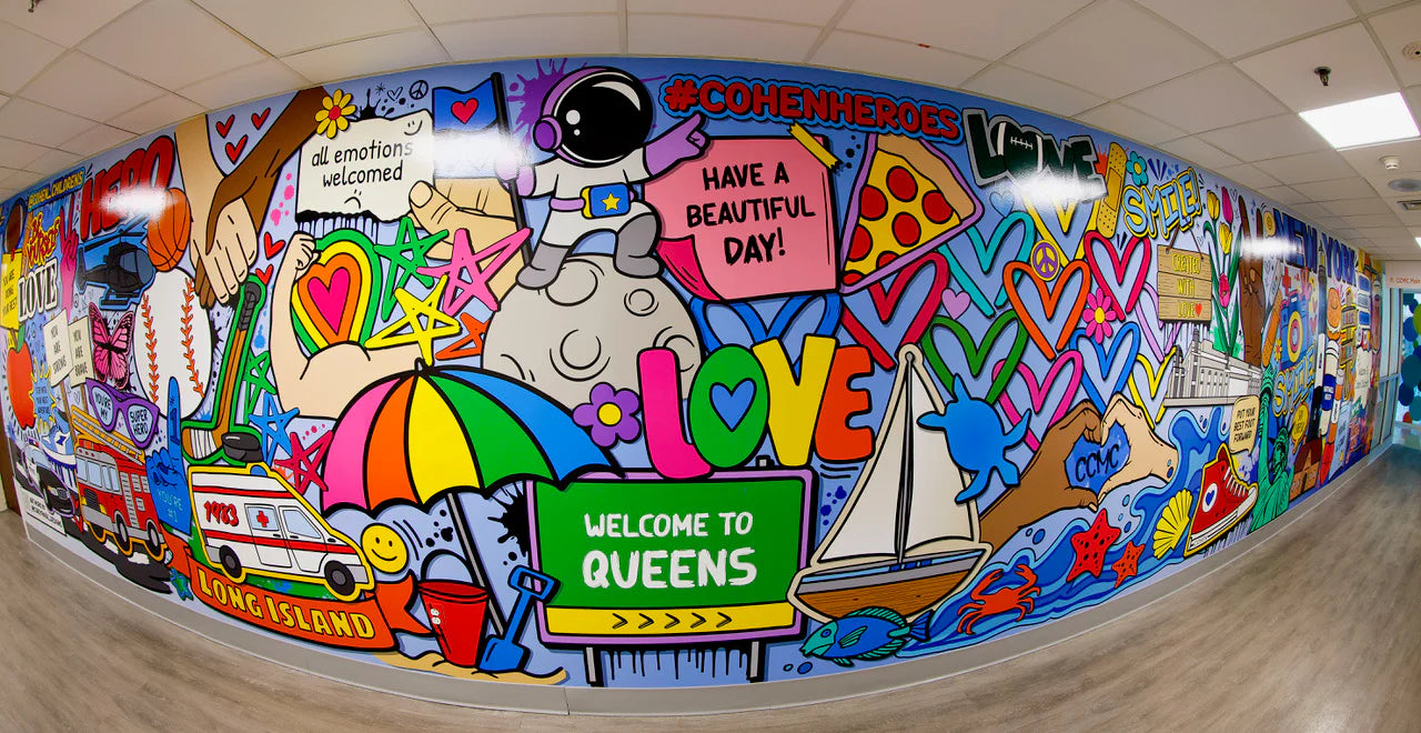 I am so honored and proud to donate my artwork and share my creative process with the incredible patients. In December 2023, I attended the unveiling of my 50ft mural at Cohen Children’s Medical Center. My mission as an artist is to make a positive impact, and I hope that this mural brings smiles to the faces of those who walk by. Also, feeling incredibly humbled to have my artwork hanging alongside the masterpieces of Keith Haring and Andy Warhol.
