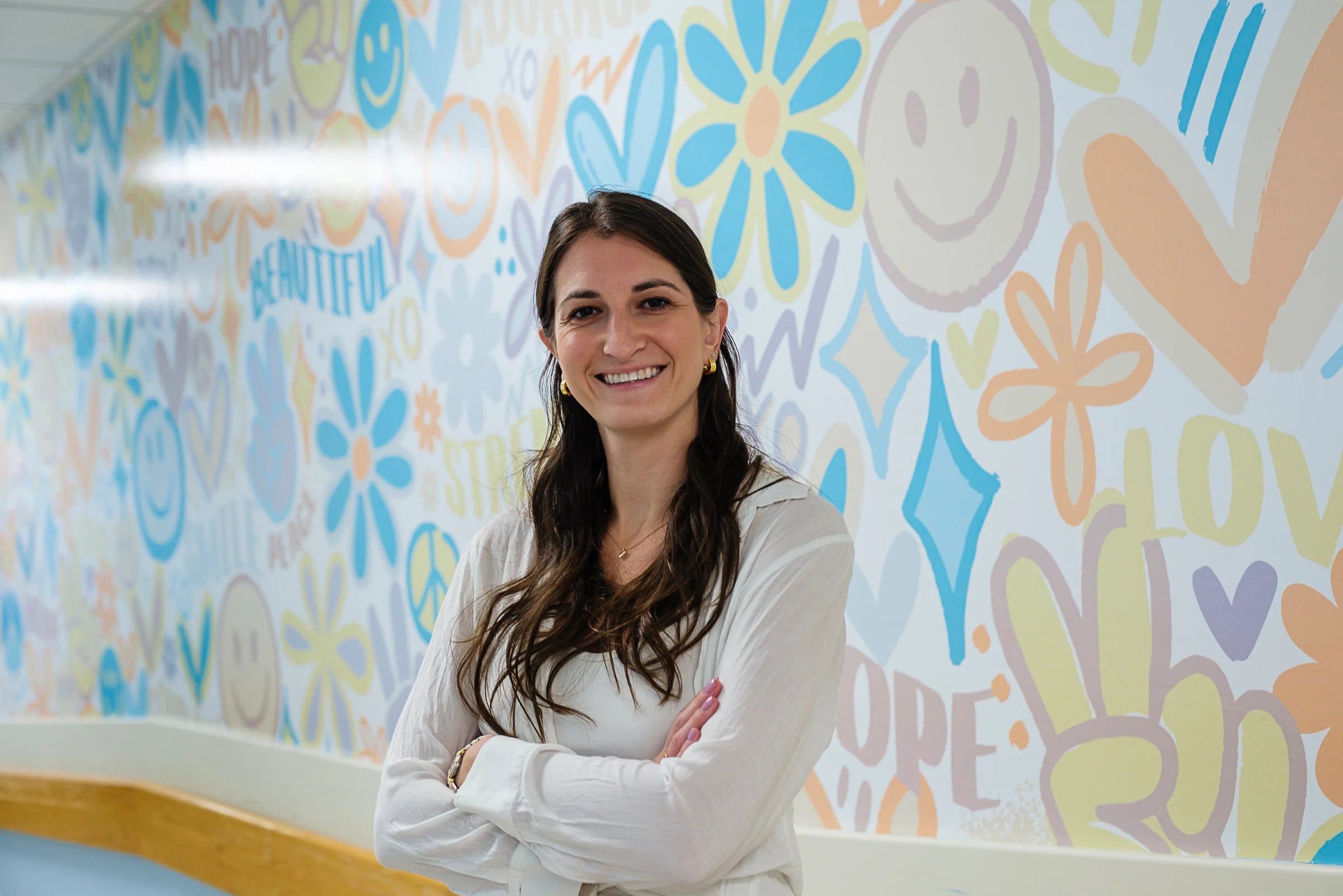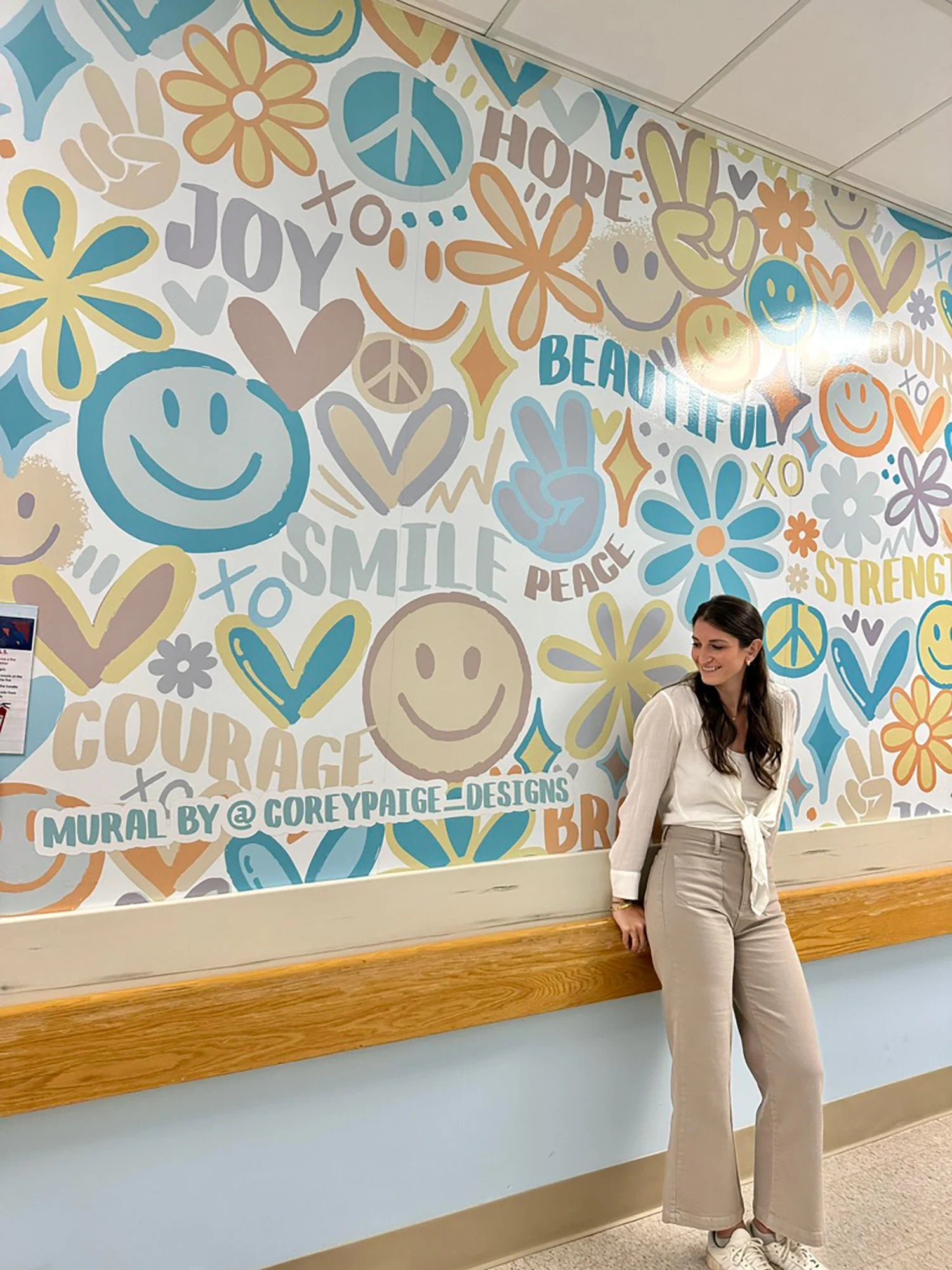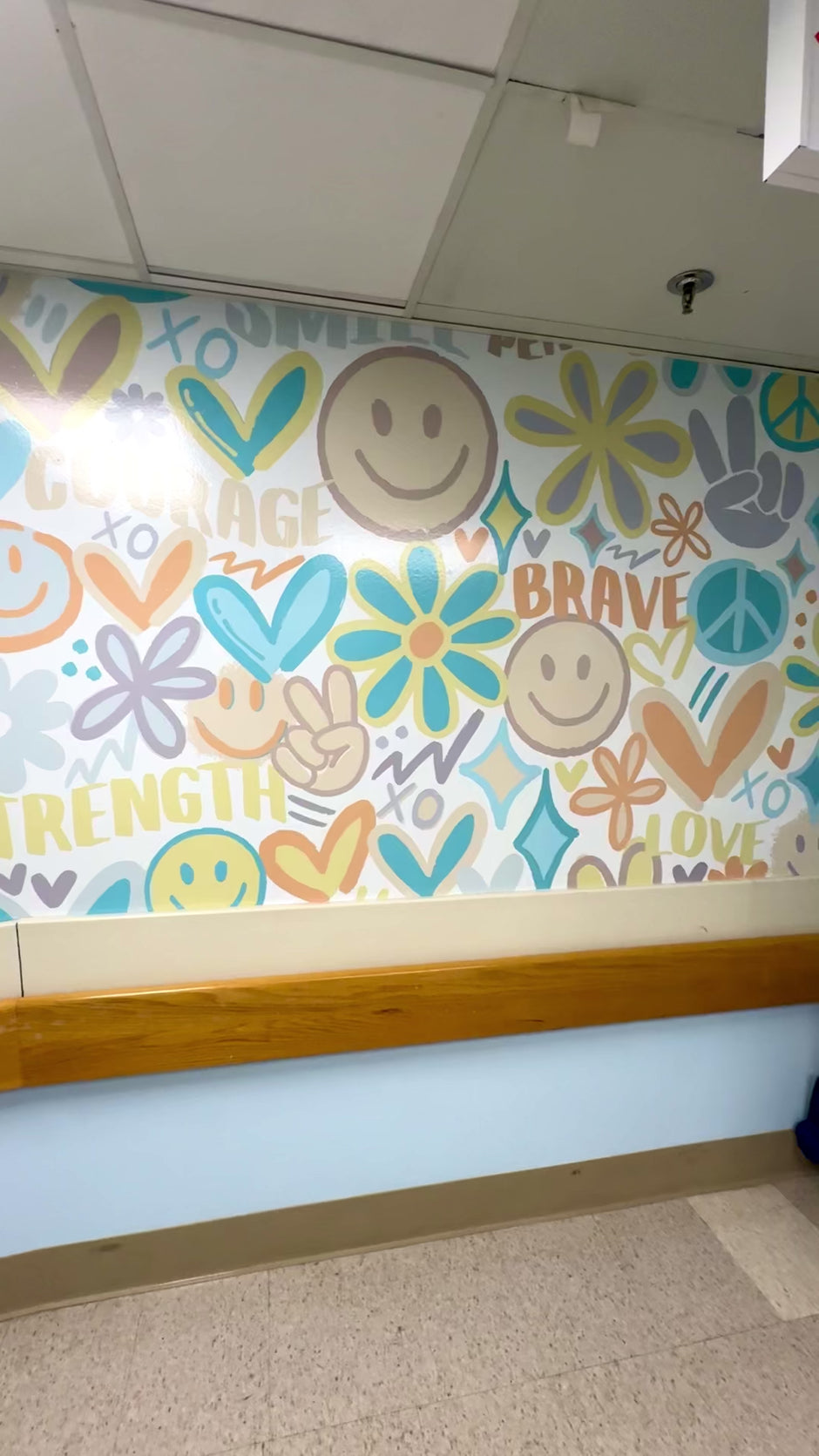 The mural consists of calming colors and features positive wording such as courage, strength, brave, beautiful, smile, and joy. The mural was installed in September 2024 in honor of NICU Awareness Month.