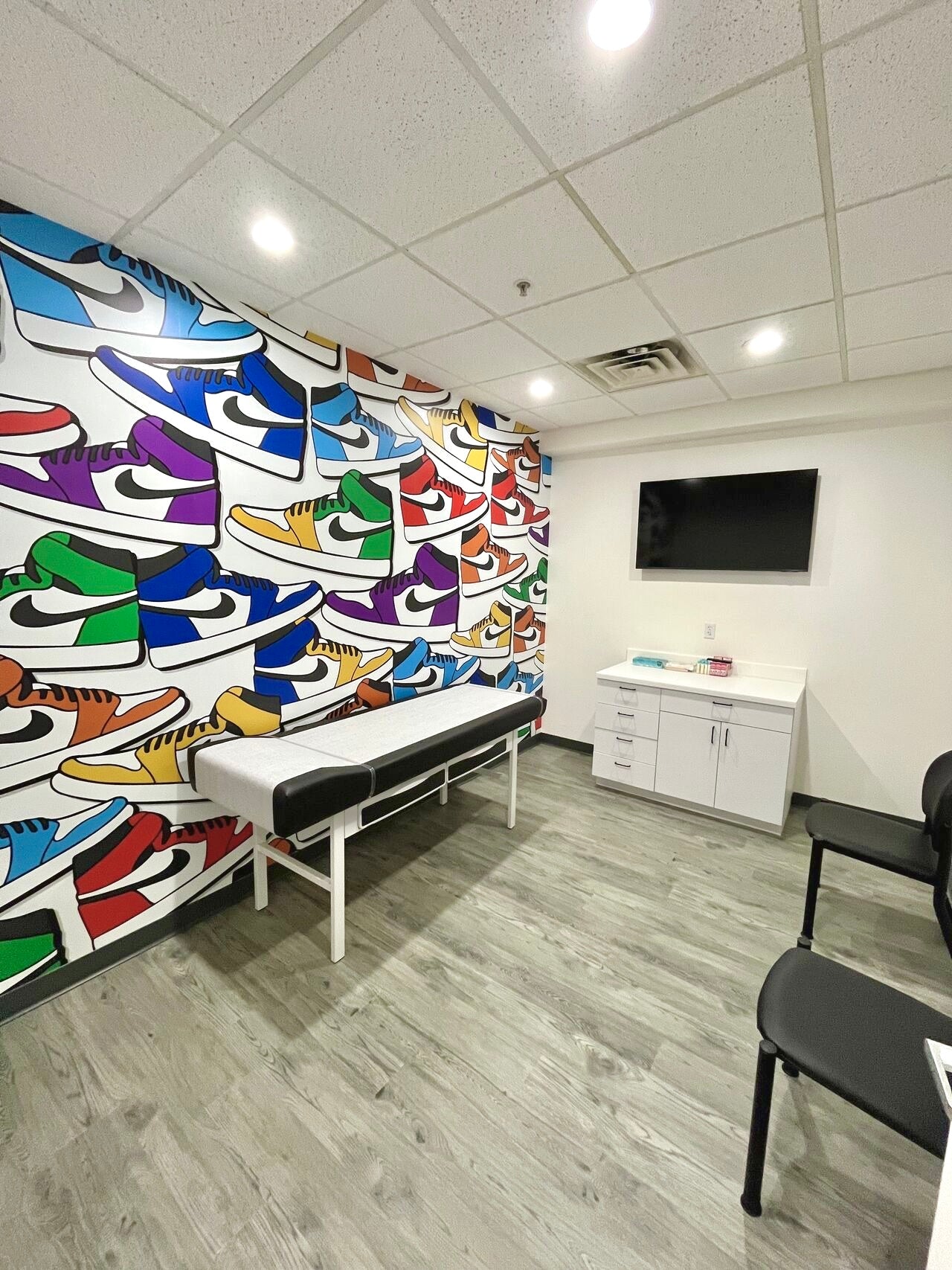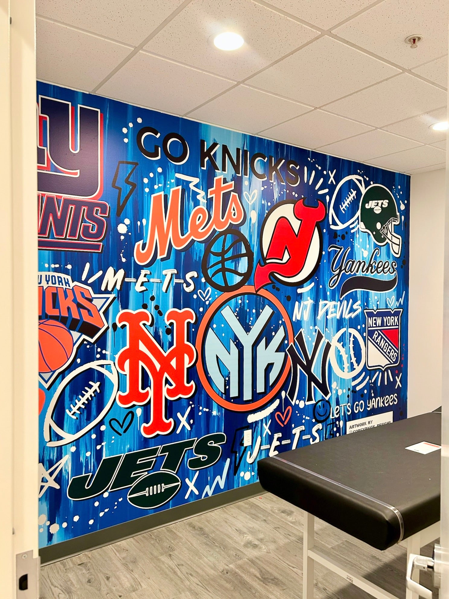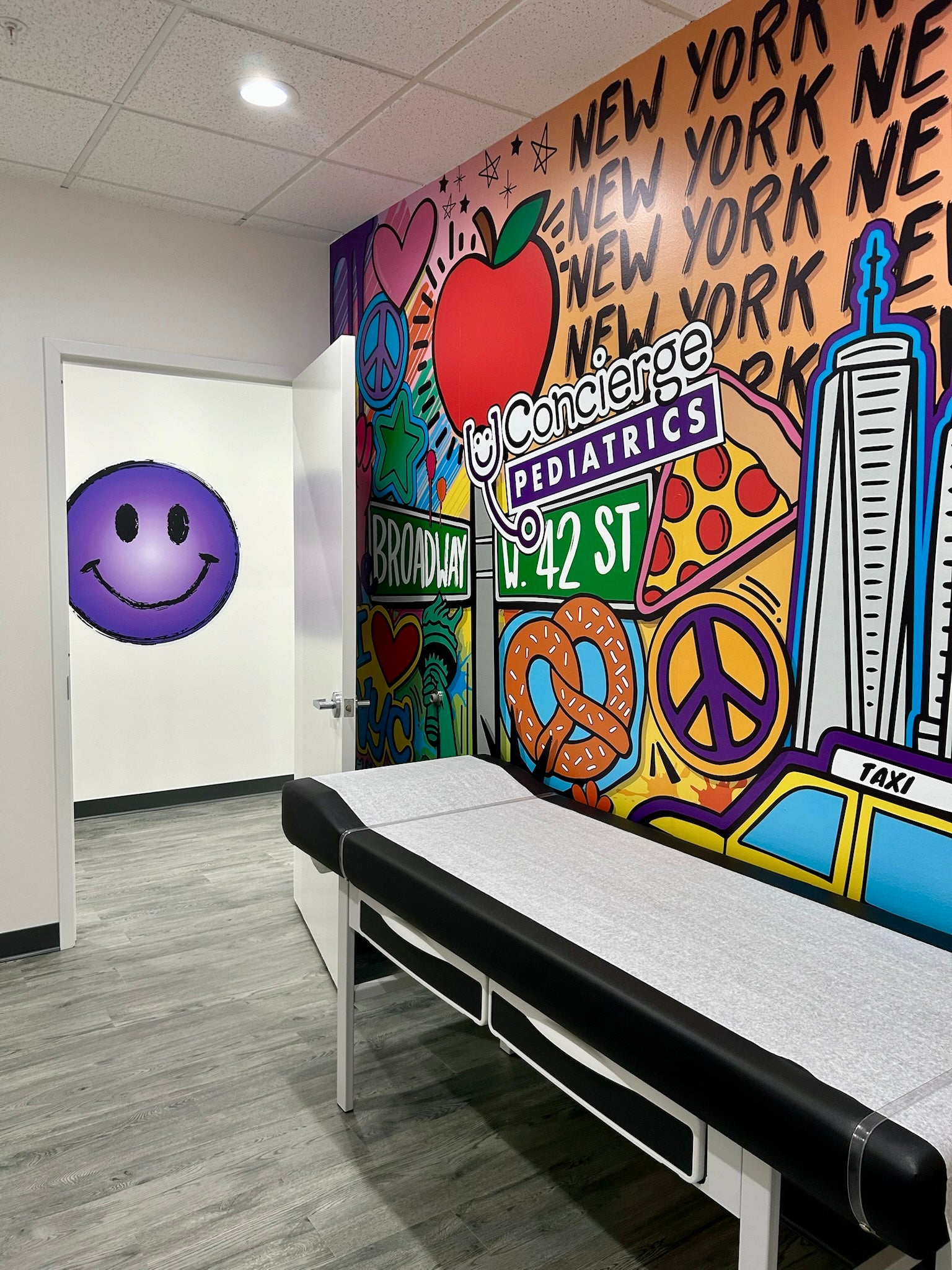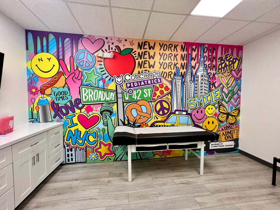 Corey was commissioned to create a series of vibrant vinyl wall murals for Concierge Pediatrics, transforming their exam rooms into colorful, welcoming spaces designed to comfort and inspire young patients. With her signature joyful style, she infused each room with energy & playful details that brighten every visit. Her artwork can now be found across all three Concierge Pediatrics locations — Roslyn, Woodbury, and Short Hills, NJ — bringing smiles to families throughout the community.