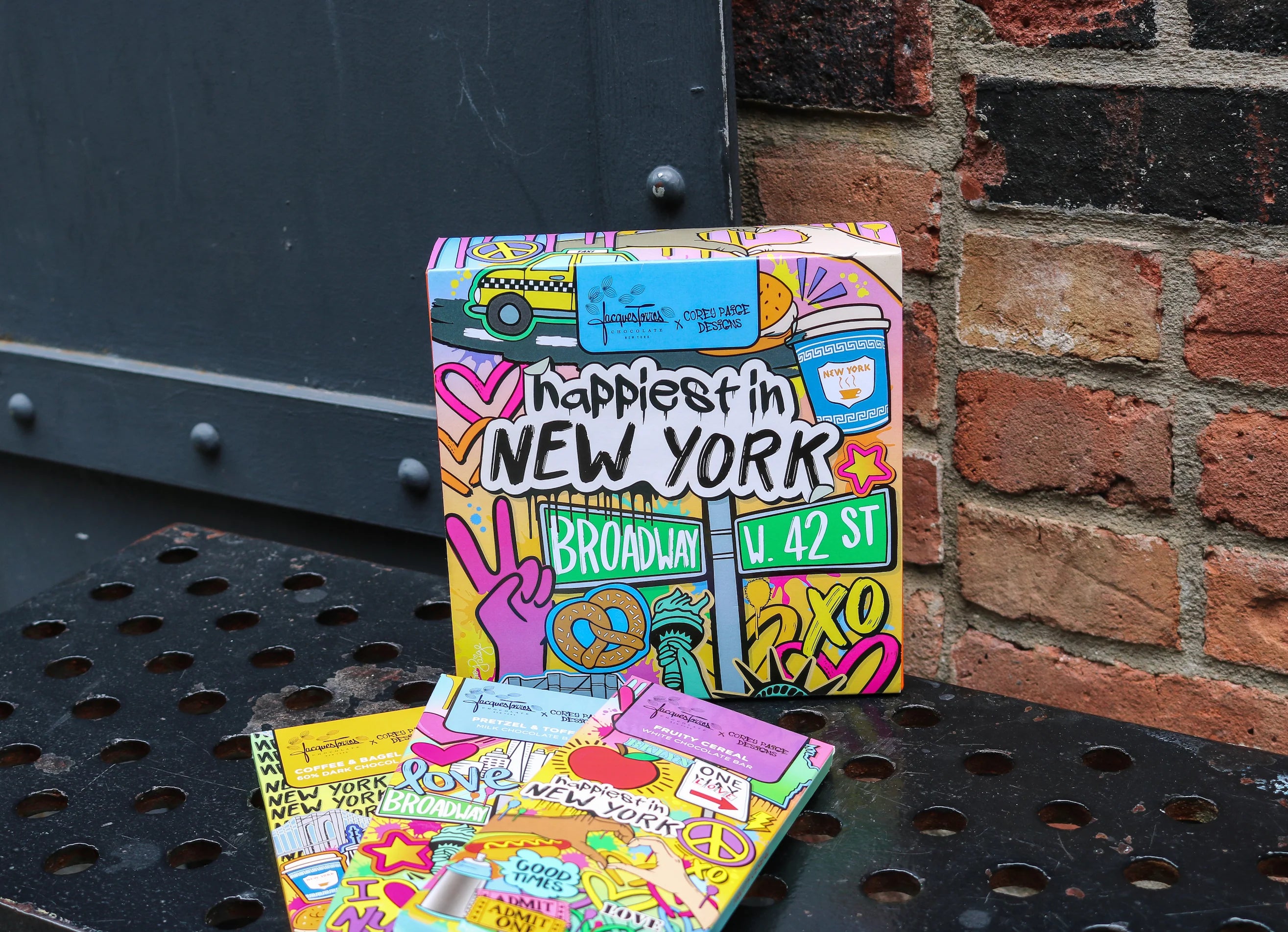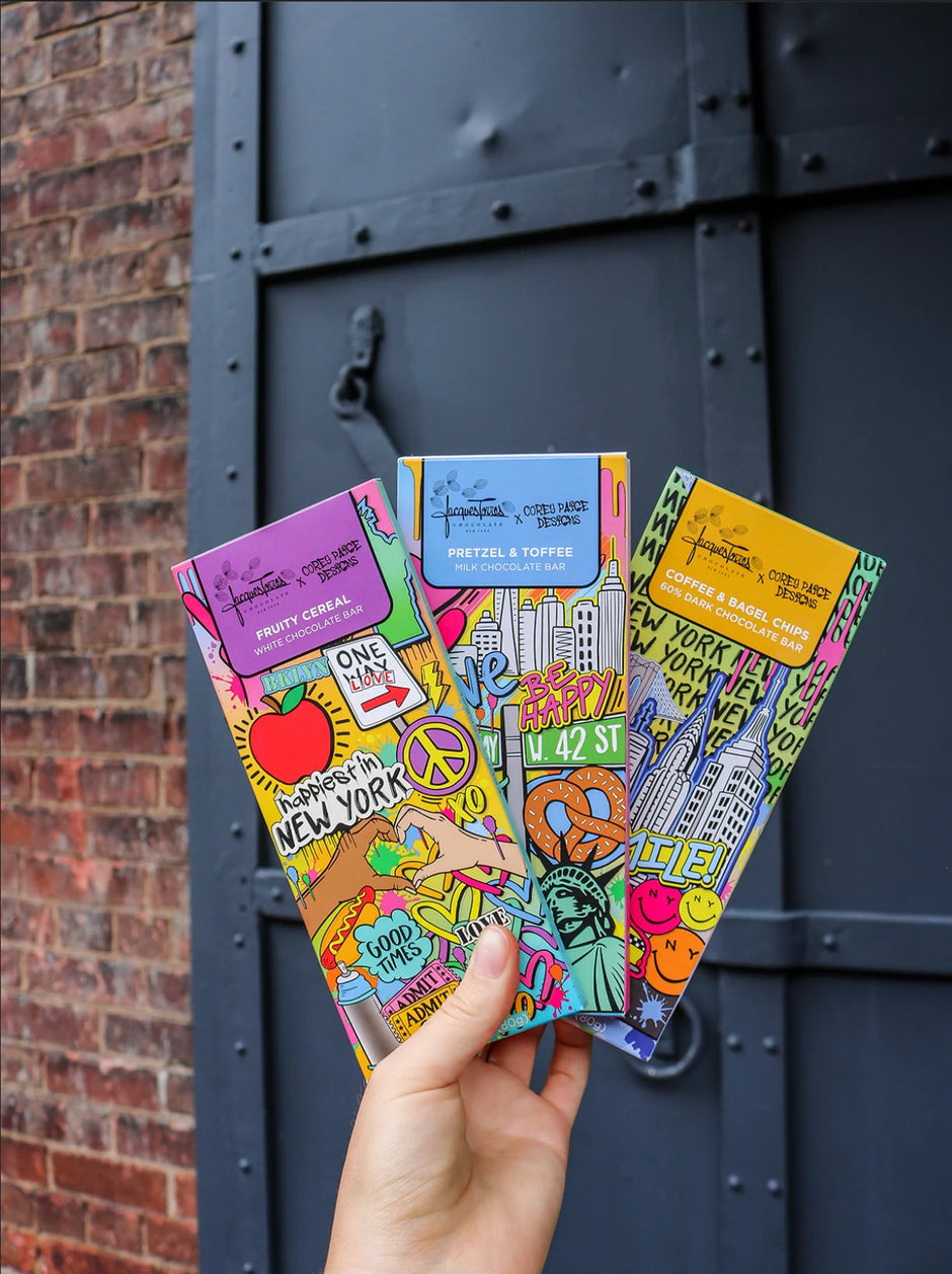 Corey Paige Designs is thrilled to announce a new collaboration with Jacques Torres Chocolate! Known for a love of all things sweet, Corey created unique, vibrant artwork for this capsule collection, capturing the dynamic energy and excitement of New York City. Now available at Jacques Torres Chocolate’s Dumbo, Brooklyn and Grand Central Terminal locations, as well as online at mrchocolate.com, this collection brings joy and a splash of color to every chocolate lover’s experience.