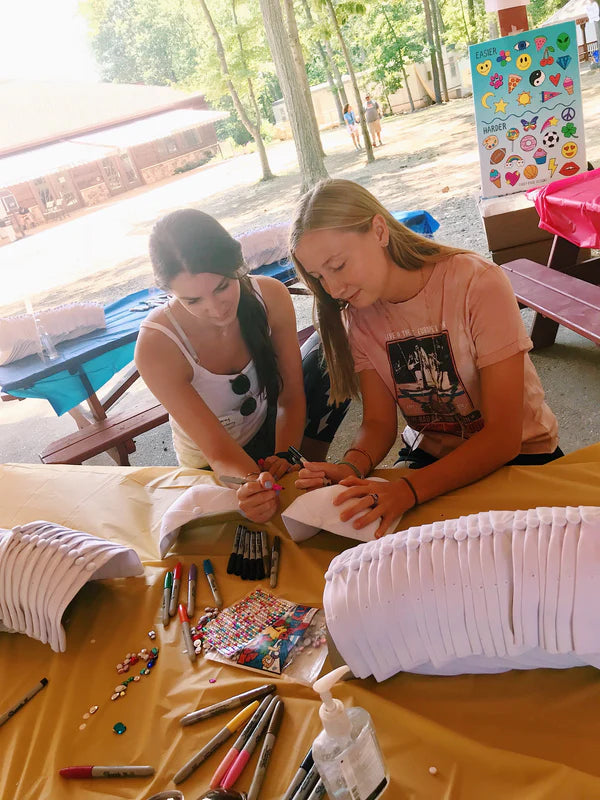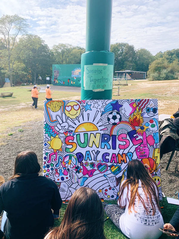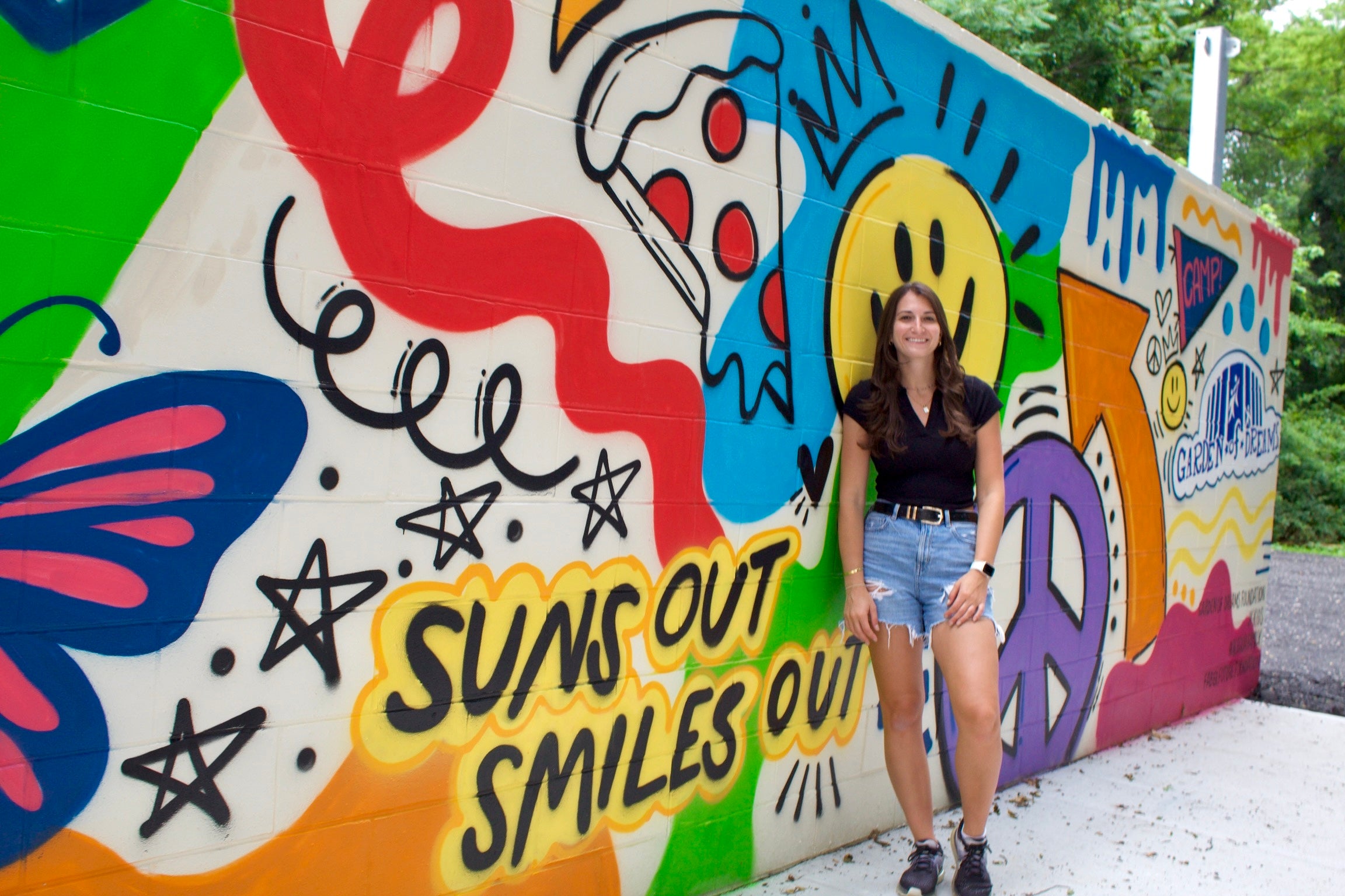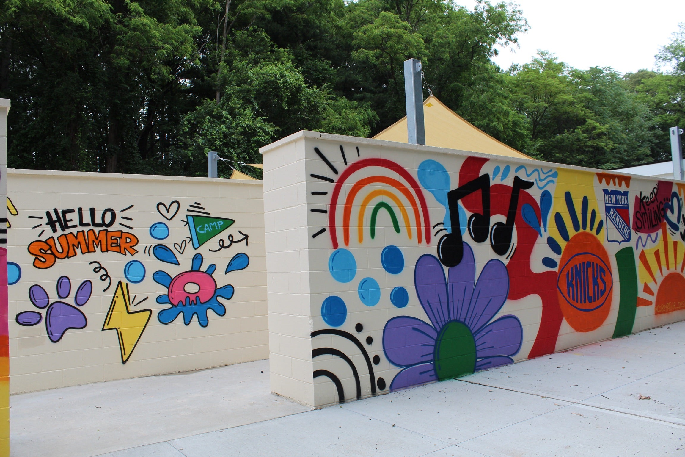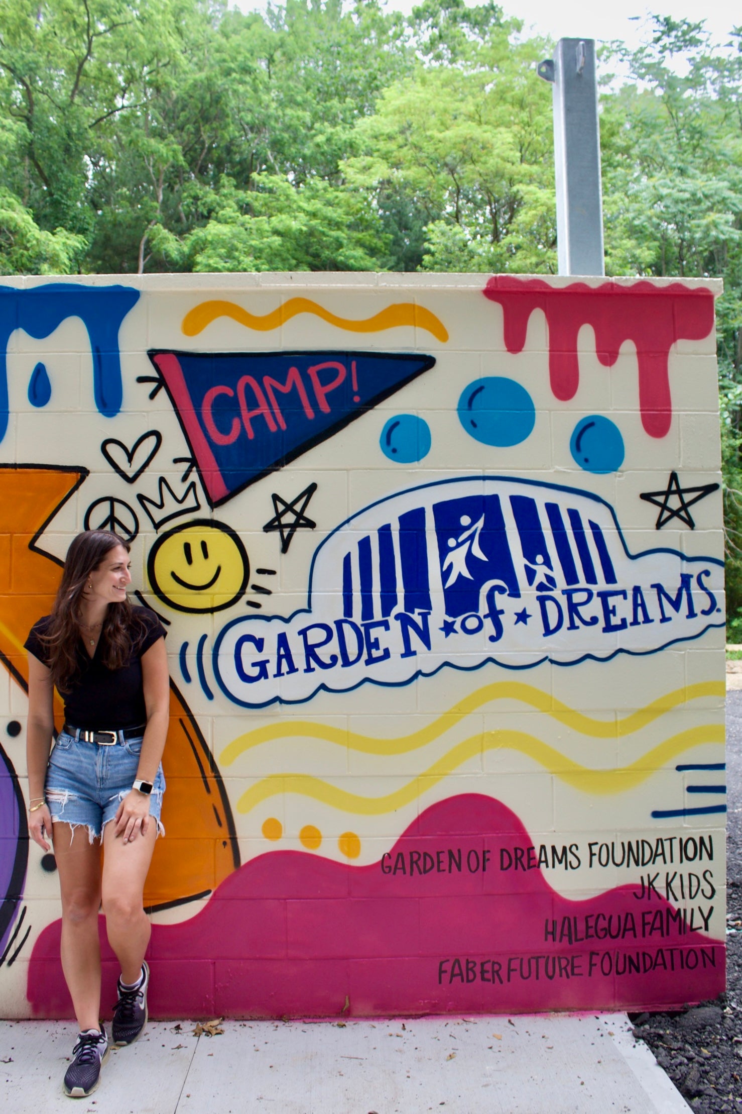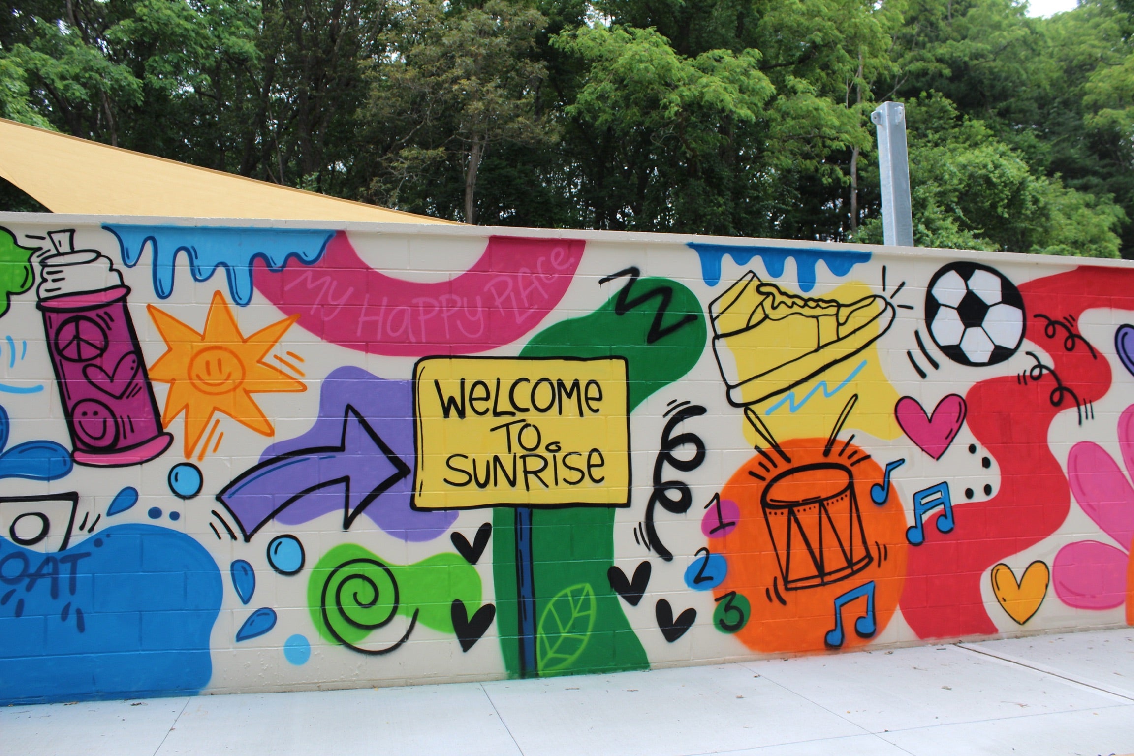 Corey Paige Designs has continuously partnered with Sunrise Day Camp. Sunrise is the world’s only dedicated day camps for children with cancer and their siblings, provided completely free of charge. Corey has created custom designs for their camps and walk-a-thons, contributed at volunteer days, and served as a co-chair on the Sunrise on the Rocks committee. In 2022, Corey donated a large mural at the entrance of the camp, giving a dated building an upgrade with vibrant pop art. For the summer of 2025, Corey was commissioned to create another large wall mural for the new bathhouses and upgraded poolside changing station, which were funded by the Garden of Dreams Foundation and other generous partners.